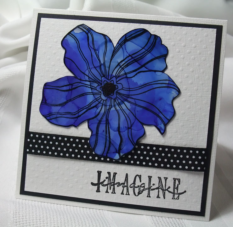 The blue on my card is the giant flower from Hero Arts colored with alcohol ink. "Imagine" is from Stampers Anonymous. (Dribble 2 or 3 drops of alcohol ink on glossy cardstock; add some blending solution and tilt paper for coverage. Add more solution, if desired. Dry completely. Stamp image with permanent ink and cut out. I also added black microbeads to the center with some Glossy Accents as adhesive.)